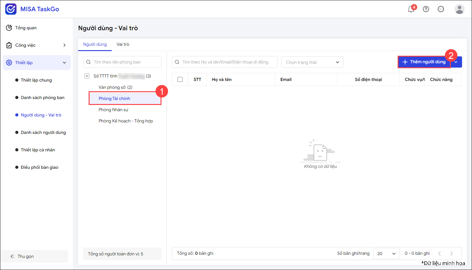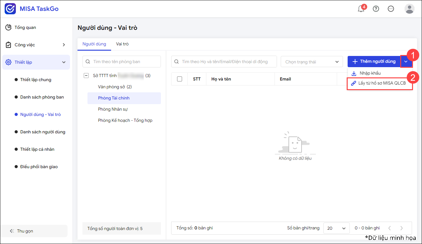 - Nếu chưa thiết lập phòng ban, chức vụ trên MISA TaskGo: