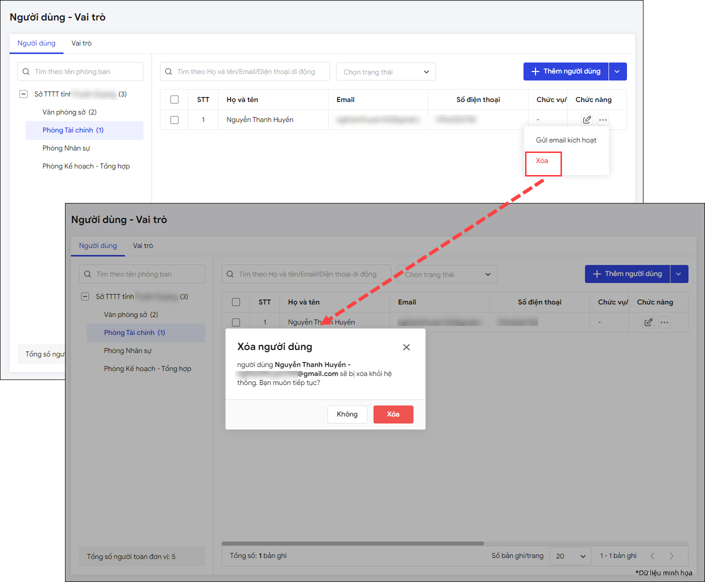 - Với những cá nhân đã thôi công tác tại đơn vị, có thể thực hiện xóa người dùng bằng cách nhấn vào dấu “ba chấm”, chọn Xóa.