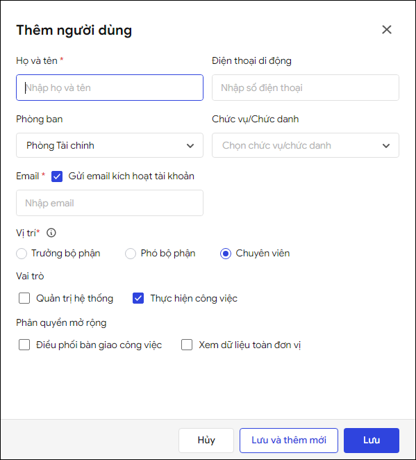 - Nhấn Lưu để thêm mới người dùng, nhấn Lưu và Thêm mới để lưu thông tin và tiếp tục thêm nhanh thông tin người dùng.