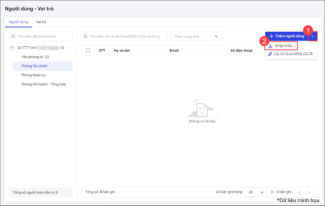 - Vào Thiết lập\Người dùng – Vai trò, tại mục Người dùng, phần mềm lấy lên danh sách phòng ban anh/chị đã thiết lập.