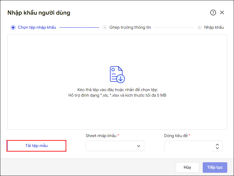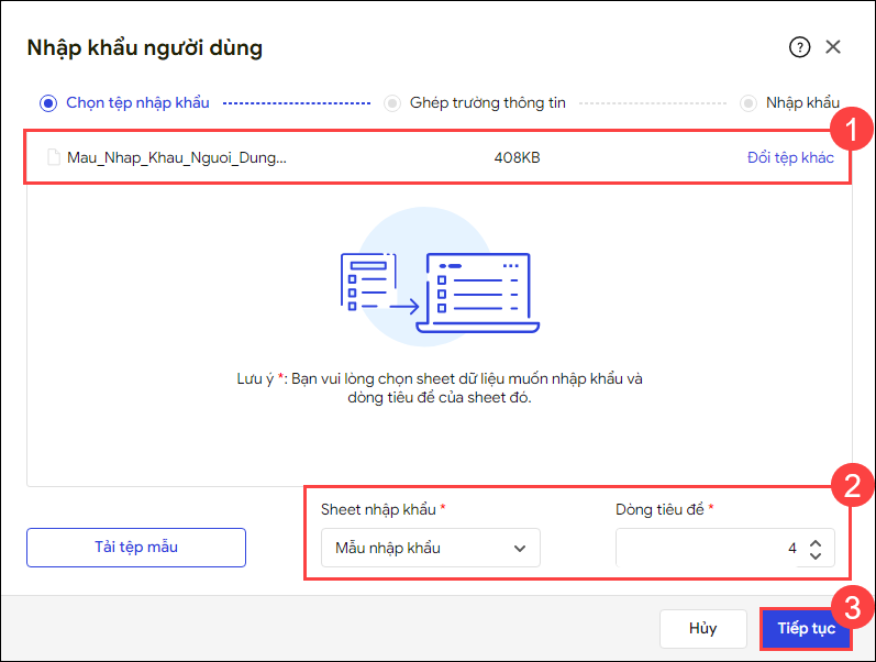 - Tải lên file thông tin người dùng vừa nhập, chọn Sheet nhập khẩu và Dòng tiêu đề tương ứng của file.
