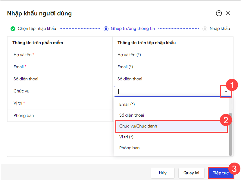 - Nếu anh/chị dùng file mẫu của phần mềm, phần mềm tự động Ghép các trường thông tin. Trường hợp dùng file sẵn bên ngoài, anh/chị vui lòng ghép cột để đồng nhất các trường thông tin tương ứng giữa hai file. Nhấn Tiếp tục.