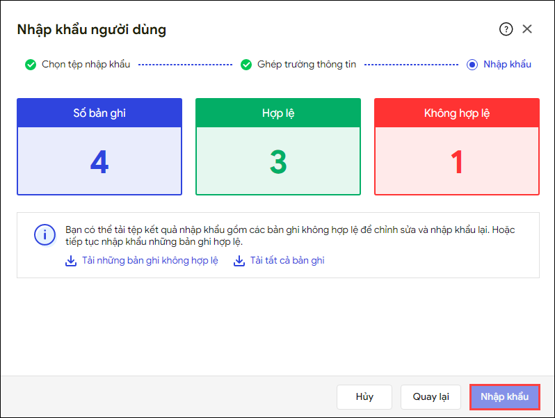 - Với bản ghi Hợp lệ: Chọn Nhập khẩu để nhập khẩu danh sách người dùng vào phần mềm.