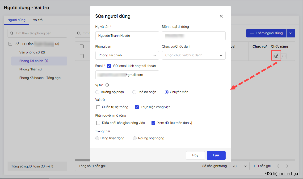 - Trường hợp có thay đổi thông tin người dùng, anh/chị nhấn vào biểu tượng cây bút để chỉnh sửa thông tin. Nhấn Lưu để cập nhật thay đổi.