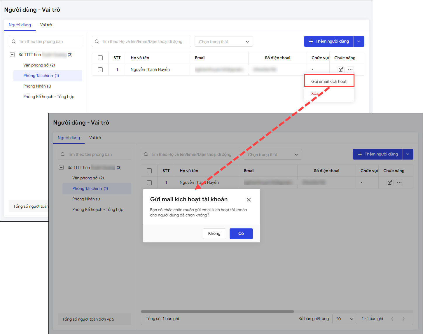 - Trường hợp khi thêm người dùng nhưng chưa gửi email kích hoạt, anh/chị có thể gửi thông báo bù bằng cách nhấn vào biểu tượng dấu “ba chấm”, chọn Gửi email kích hoạt.