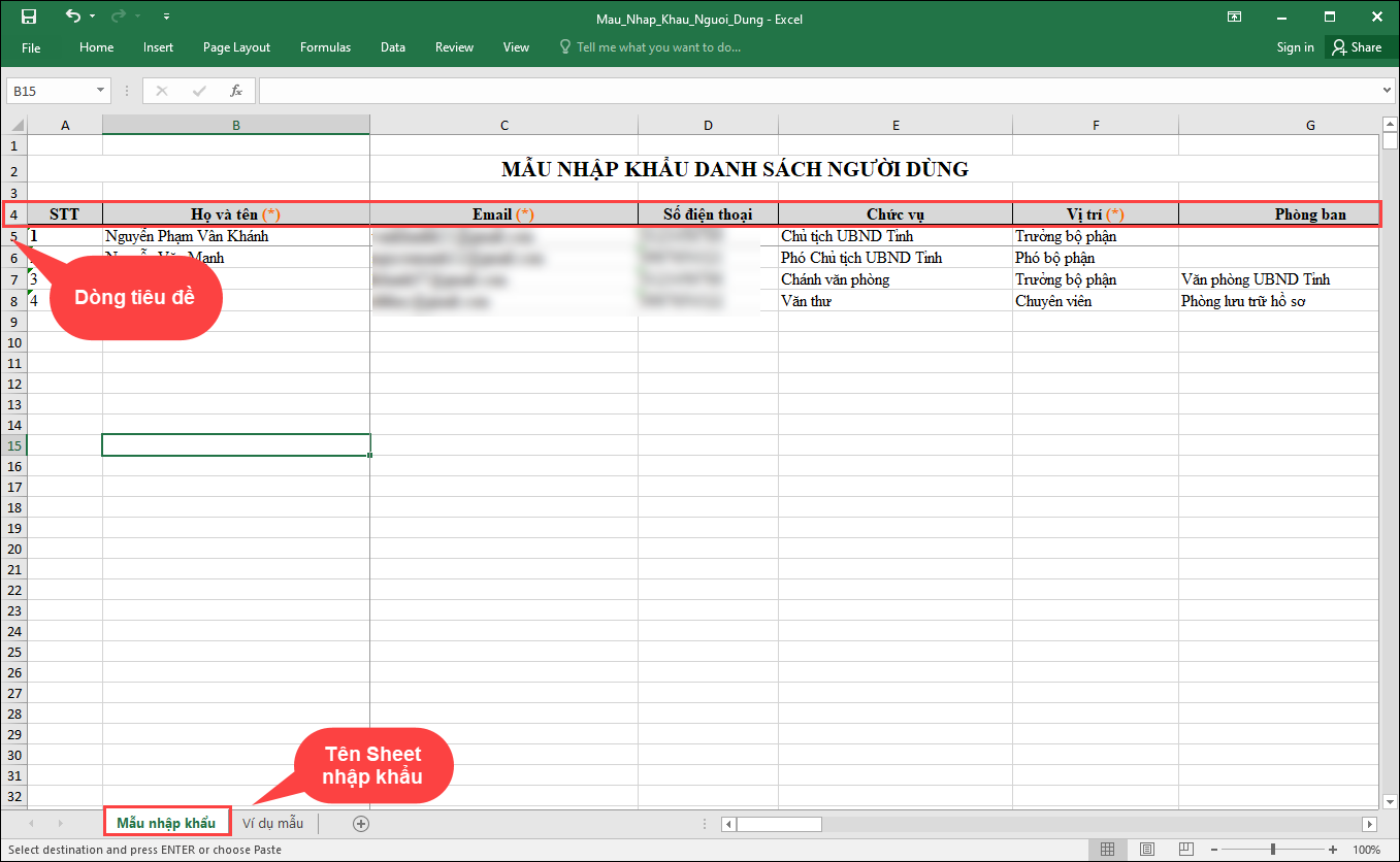 (Lưu ý: Mẫu thông tin Sheet nhập khẩu và Dòng tiêu đề được xác định như bên dưới.)