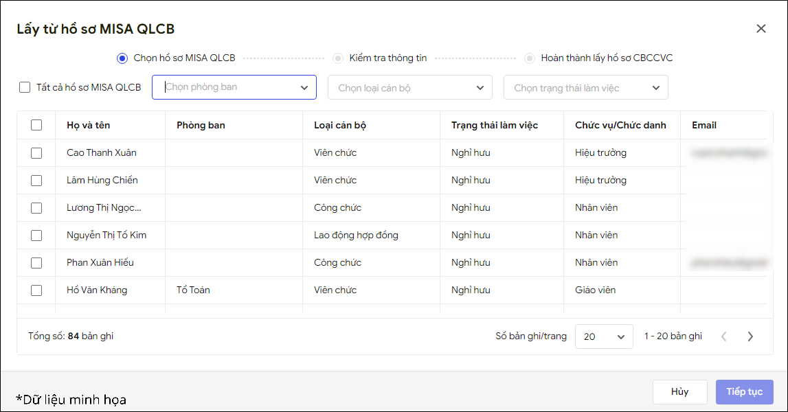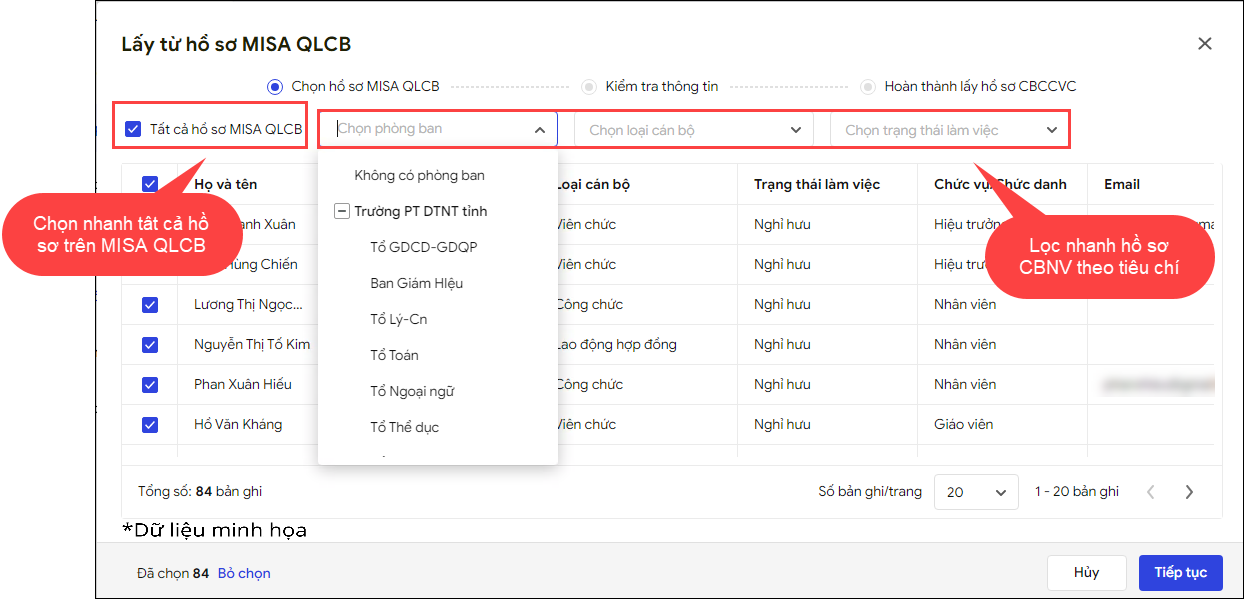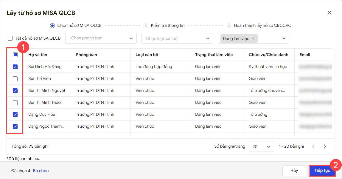 - Tích chọn những hồ sơ CBNV muốn lấy thêm nhanh từ MISA QLCB vào MISA TaskGo, nhấn Tiếp tục.