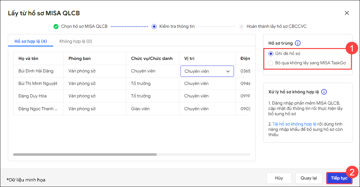 - Với những hồ sơ Hợp lệ: Anh/chị kiểm tra lại tất cả thông tin. Trường hợp có Hồ sơ trùng (Là hồ sơ trên MISA QLCB có trùng thông tin email với người dùng đã có trên MISA TaskGo), anh/chị tùy chọn Ghi đè hồ sơ hoặc Bỏ qua không lấy sang MISA TaskGo.
