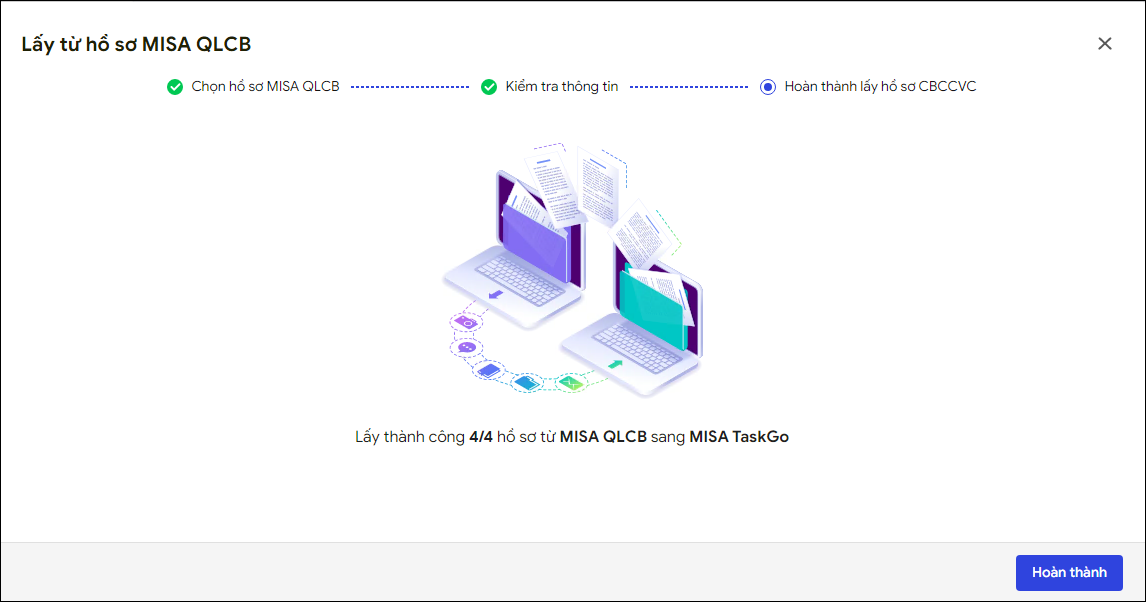 - Phần mềm tự động lấy hồ sơ hợp lệ từ MISA QLCB trực tiếp về MISA TaskGo. Sau khi hoàn tất quy trình sẽ hiển thị kết quả như thông báo bên dưới.