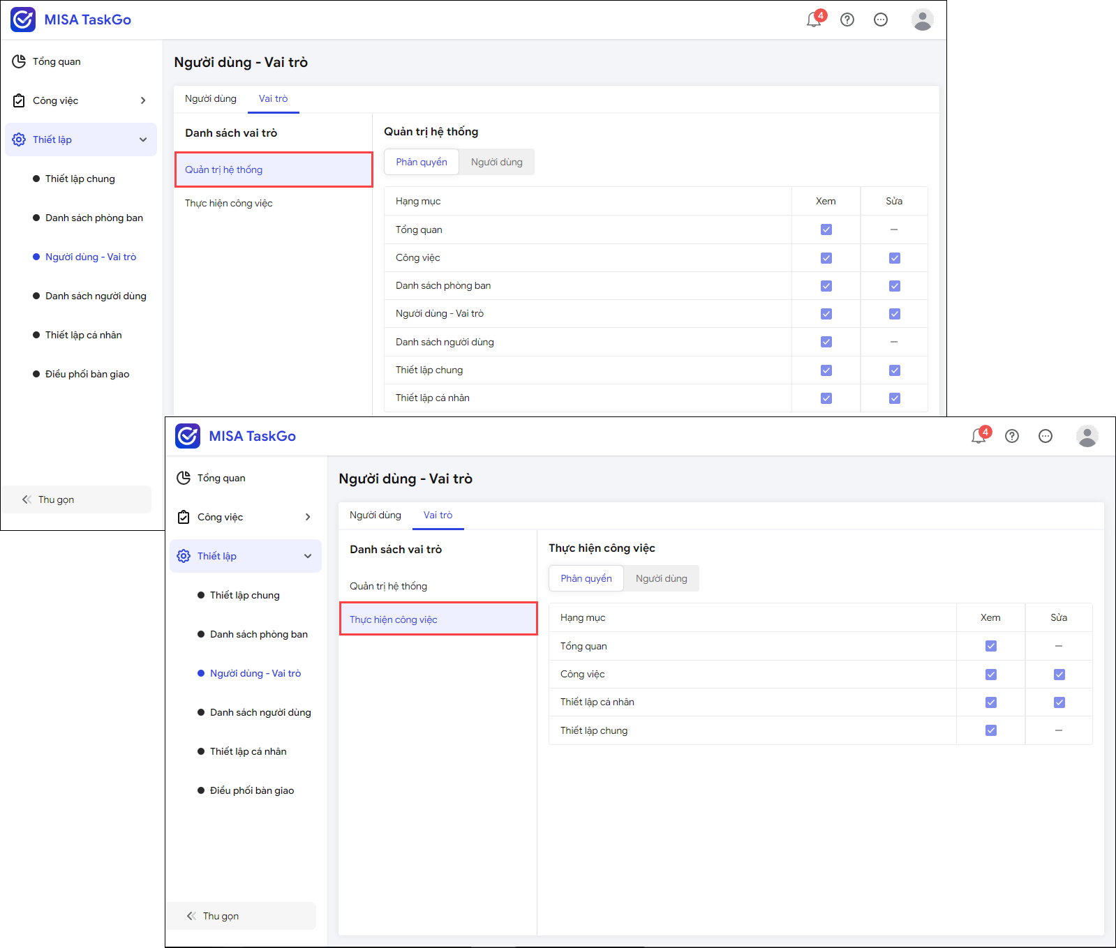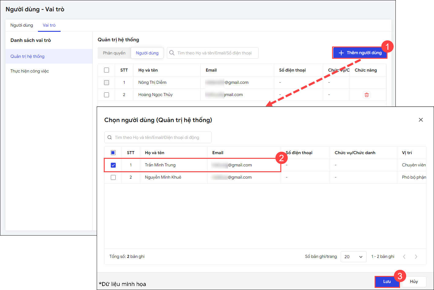 - Vai trò: Tích chọn phân quyền cho người dùng Quản trị hệ thống hoặc chỉ có quyền Thực hiện công việc.