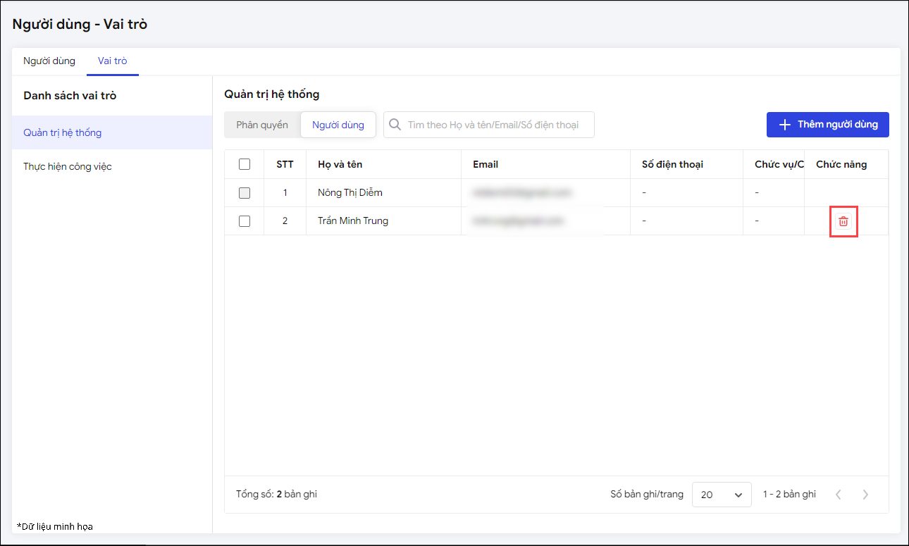- Để xóa người dùng khỏi vai trò, nhấn vào biểu tượng xóa tại dòng người dùng tương ứng.